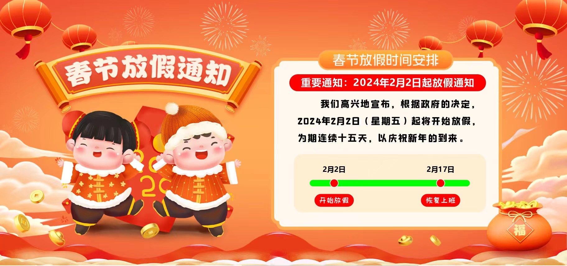 我們高興地宣布,根據政府的決定,2024年2月2日(星期五)起將開始放假,為期連續十五天,以慶祝新年的到來。